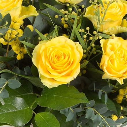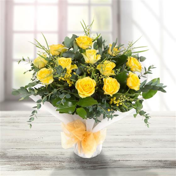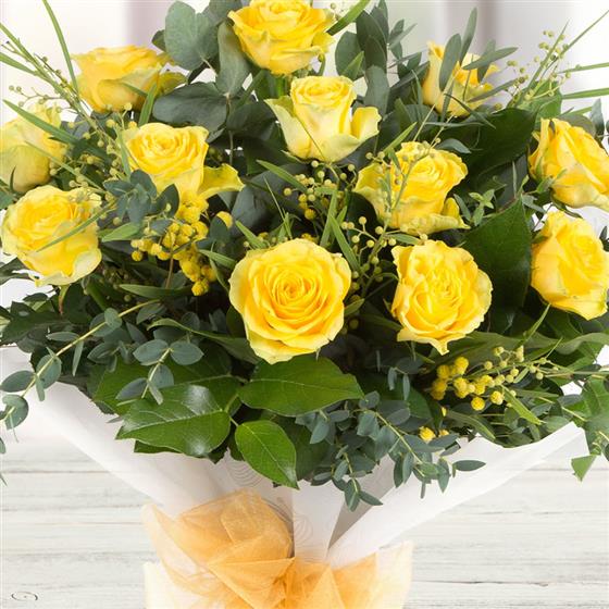 A dozen long stemmed golden yellow roses complemented with varigated foliage presented hand tied in water.