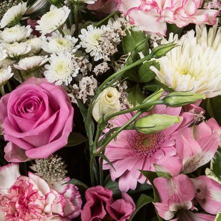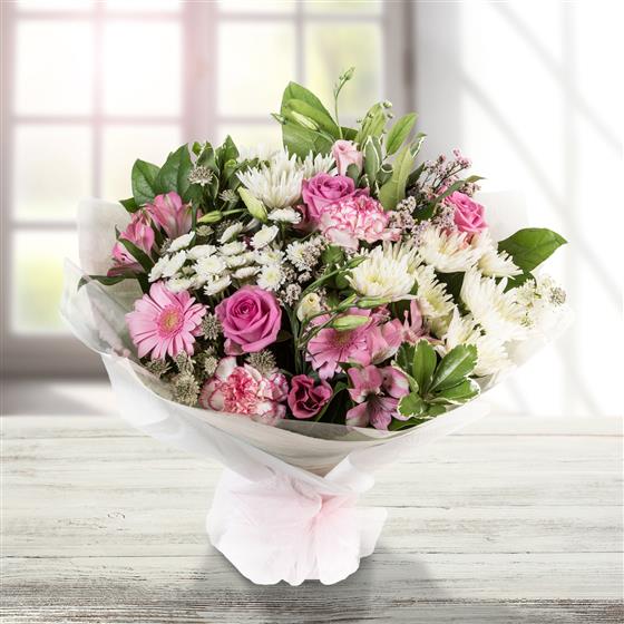 Our most popular hand tied bouquet, a collection of blooms in shades of pink and cream, hand-tied in water and finished with a complementary wrap.