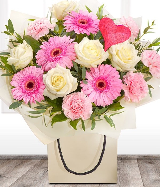 A cheerful aquapack gift bag including beautifully pure cream roses, bold pink gerberas and delicate pink carnations, scent with love accompanied by a red heart decoration.