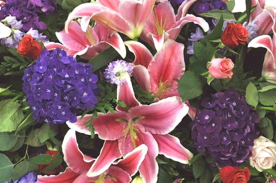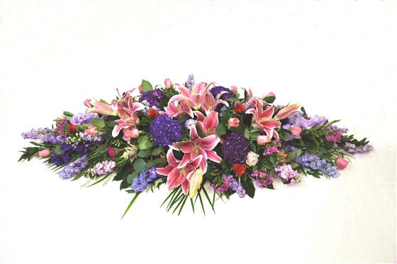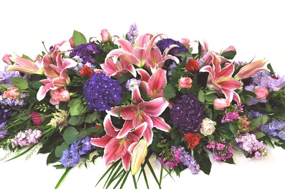 In summer blues, pinks, lilacs, and purples this beautiful spray includes lilies, delphinium, hydrangeas, mini gerberas and alstromeria.